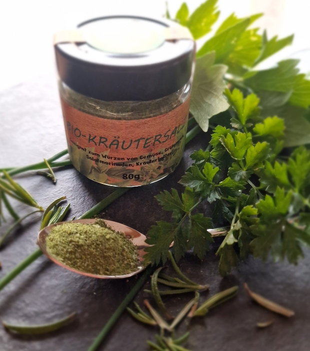 Aromatisches Gewürzsalz mit getrockneten Kräutern aus dem Bauerngarten - perfekt zum Verfeinern von Fleischgerichten, Gemüse & Salaten.